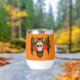 Un grand hibou brun à cornes avec un jour de crâne de sucre mort et des roses rouges dans un fond d'orange.