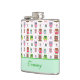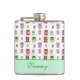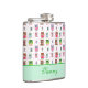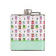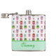 Fun lady's drink flacon, avec de mignons dessins animés de chouettes et pois roses, verts et marrons colorés, sur un arrière - plan blanc. Un groupe vert menthe, en bas, a du texte vert prêt à être personnalisé. Idée cadeau mignonne.