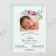 Un amas de fleurs roses et vertes encadrent la photo de votre bébé. Embellisté avec une petite croix. Consultez notre boutique soeur Pixieprints.com pour tous vos besoins d'invitation.