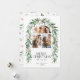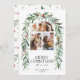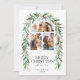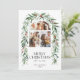 Photo de Noël Collage de la carte de vacances botanique. Belle carte de Noël avec une arche avec 3 photos jumelées avec des baies rouges aquarelles peintes à la main et une couronne d'arc de verdure d'hiver. Feuilles et baies motif de Noël botanique à l'arrière de l'invitation.
