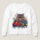 A fluffy cat wrapped in vibrant string lights, blending whimsy and warmth. Rich fur tones meet neon bulbs for playful holiday vibes on apparel.