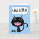 Ciao Bella ! Bonjour Belle ! Bonjour carte de voeux écrite en italien. Illustration d'un chat noir avec un squelette de poisson à ses pieds. Couleur bleue, noire, blanche et rose. Illustration a un look de dessin animé et est un design stylisé. Vierge à l'intérieur pour votre message personnel. Image et vers © Shoaff Ballanger Studios / 2015.