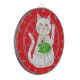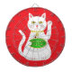 Cette magnifique carte de fléchettes présente une image graphique d'un chat oriental blanc qui a de la chance. Le chat a de beaux yeux dorés et porte un médaillon d'or sur le collier autour du cou. Le chat a des oreilles roses et des chuchotements. Ce mignon petit chaton tient un jeton doré avec une incrustation de jade verte et un message en texte doré qui dit "Bonne chance".