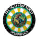 Une représentation circulaire d'un orignal aux bois, entouré d'arbres et d'une couverture cible