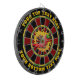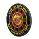 Design en dartboard rouge foncé, noir, vert et jaune. Chaque couleur est personnalisable. Piments chauds dans le cercle de flamme. Deux zones de texte personnalisées sur l'anneau extérieur.