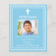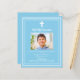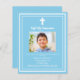 Un arrière - plan bleu ciel, décoré d'un cadre blanc, et d'une croix blanche Personnalisez et ajoutez un nom photo et des détails. Texte blanc. 1 feuille = 1 invite imprimé bord à bord.