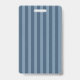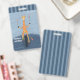 Fun blue student hall pass featuring a circus giraffe riding on a unicycle and spinning plates on the front and a stripe pattern on the back .