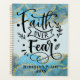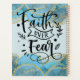 Conception de nom personnalisable pour un cadeau inspirationnel personnalisé avec une citation "Faith over Fear", en lettrage manuel moderne, avec un effet agate abstrait fait avec de l'encre d'alcool dans les couleurs bleu, gris et or.