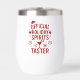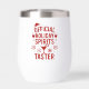 Citation : Officiel Holiday Spirits Taster. Texte rouge. Décoré de verres de vin, de casquette Père Noël, de verre de cocktail et de cristaux de neige,