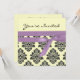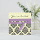 la conception a un motif noir élégant de damassé sur un fond léger de citron avec un ruban de pourpre de faux. L'inverse de la carte a une petite rime mignonne. Tout le texte est entièrement personnalisable. vous pouvez également changer la couleur d'arrière - plan de la carte en cliquant sur sur la "personnaliser" et alors "colorez". l'invitation est montrée ici dans une finition de toile. d'autres finitions sont disponibles !