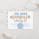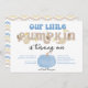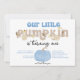 Fêtez le jalon de votre petit garçon avec cette invitation de premier anniversaire "Notre petit Citrouille" ludique! Avec un charmant citrouille d'aquarelle bleue, des accents floraux gais et une typographie amusante avec un dresseur de chevrons en zigzag, cette invitation apporte charme et ambiance festive à votre fête d'anniversaire d'automne. Personnalisez avec le nom de votre enfant, la date de la fête et l’emplacement de votre fête pour une célébration joyeuse et personnalisée.