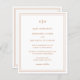 Style classique tonalité terre tout en un faire-part de mariage budget dans une couleur terre cuite / rouille / orange avec un design simple et minimal avec votre monogramme en haut et vos détails de l'événement entouré d'une double bordure. Les fontes alternent entre un script élégant, une fonte serif traditionnelle et minimaliste sans serif. Le dos contient vos informations d'invité ainsi qu'un code QR optionnel (si vous préférez, vous pouvez supprimer le code QR dans l'outil de modification de conception). Cette invitation est idéale pour un mariage officiel.
