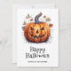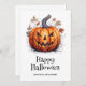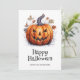 Carte d'Halloween aquarelle avec citrouille éffrayant et feuilles d'automne. Personnalisez facilement cette carte d'Halloween minimaliste avec votre nom de famille et votre texte.
