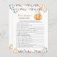 "Une petite citrouille est en route. Célébrez avec ce thème de citrouille de dessin animé pour bébé pour la fête de bébé ! Citrouille de dessin animé kawaii mignonne avec chapeau d'automne (casquette) et feuilles d'automne. Au verso de la carte se trouvent des feuilles d'automne.