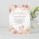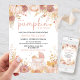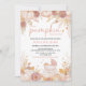 Bienvenue à un petit citrouille avec cette charmante invitation baby shower d'automne pour une petite fille ! Cet hôtel au design blush et or est doté de citrouilles roses peints à la main, de fleurs d'aquarelle et d'une poussette de style antique. Il est parfait pour une fête d'automne avec élégance rustique. Personnalisez avec vos propres détails de baby shower. Idéal pour un baby shower confortable sur le thème des chutes.