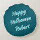 Citrouille turquoise Halloween Coussin - Custom Text & Colors, Double face ronde Célébrez Halloween avec style cosy et esprit inclusif en utilisant ce citrouille turquoise jetez un oreiller! Un côté est équipé d'un jack-o’lanterne turquoise souriant, tandis que l'inverse peut être customisé avec votre propre message d'Halloween, nom ou salutation. Que vous décoriez votre porche, votre canapé ou votre espace de fête, ce coussin rond souple ajoute une touche festive et sensible à l'allergie à votre espace. Customisez tout, du texte et de la police à la couleur et à l'image arrière - plans pour un accent saisonnier vraiment personnel. Un cadeau, une fête ou une déclaration décorative qui vous montrera une ambiance d’Halloween accueillante et sûre. Cette conception appuie la sensibilisation aux allergies alimentaires et le recours à des astuces ou à des traitements inclusifs, mais n'est affiliée à aucune organisation spécifique.