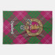 Clan Crawford crête badge entouré d'une sangle et boucle sur l'arrière - plan tartan. Texte personnalisé.