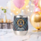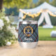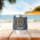 Clan MacKay crête badge entouré d'une sangle et boucle sur l'arrière - plan tartan bleu. Texte personnalisé des deux côtés.