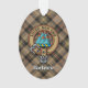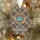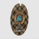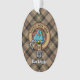 Clan MacKenzie badge de crête entouré d'une courroie et boucle sur un arrière - plan tartan brun de chasse. Texte personnalisé des deux côtés.