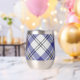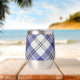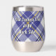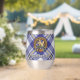Clan MacPherson crête badge entouré d'une sangle et boucle sur la robe bleue arrière - plan tartan. Texte personnalisé des deux côtés.