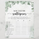Ce jeu classique de baby showers à eucalyptus est une activité rustique et ludique pour un baby shower minimaliste. Le design présente de beaux feuilles d'eucalyptus vert aquarelle.