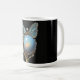 An imaginary gemstone flower composed of a large opal, tiny pearls, and a turquoise butterfly, decorate this pretty mug.
