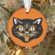 Cet ornement acrylique cintré rond est orange avec un visage de chat noir Halloween classique avec des doigts et des accents orange et blanc. Customisez votre texte à l'arrière avec le modèle.
