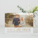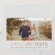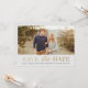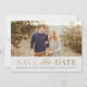 Une annonce de faire-part de date avec un type classique et une écriture calligraphique dans une texture de feuille d'or fausse (destinée à ressembler à une feuille mais ce n'est pas réellement une feuille pressée) et une ouverture de photo de paysage.