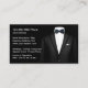 Cartes de visite Classy pour un service de Formalwear ou Tuxedo Rental conçu avec un costume pour homme sur l'avant et le dos dans ce design à deux côtés déjà organisé de sorte que vous remplacez notre texte par le vôtre.
