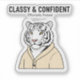 Embrace elegance with this “Classy & Confident” tiger sticker. Featuring a poised white tiger in a cozy sweater, this design combines jungle royalty with relaxed streetwear vibes. Perfect for laptops, journals, and more – for those who lead with quiet confidence and chill energy.