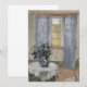 Stue Med Lyseblå Gardiner og Blå Clematis, Salon avec des rideaux bleu clair et clématite bleue (1913) d'Anna Ancher est une peinture fine d'impressionnisme ancien. De légers rideaux bleus sont suspendus au-dessus de la fenêtre avec une chaude lumière du soleil d'été qui se déverse. Une plante à fleurs de clématite provenant du jardin est posée sur une table dans l'atelier de l'artiste.