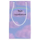 Comprend des nuages roses doux et moelleux, avec un arc-en-ciel et de petites étoiles sur un arrière - plan bleu. Personnalisez avec un nom et un message sur l'avant du sac cadeau.