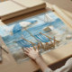 Create a calm, coastal escape with this Beach Chairs Seaside Art Print from the Nautical Blue collection by TinkPrints. Blue and white striped chairs, a breezy umbrella, and a soft ocean horizon bring relaxed beach house style to living rooms, bedrooms, bathrooms, and coastal cottages. Designed to coordinate with the Nautical Blue palette, this artwork pairs easily with matching collection pieces like wall art, coasters, mugs, kitchen towels, labels, and note cards for a cohesive blue and white coastal look.