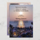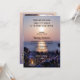 A wedding invitation featuring a sunset at the ocean with a festive lantern with sparkling lights. On the back is your photo as well as a QR code template. Beautiful for a beach or winter wedding.