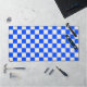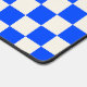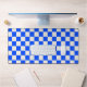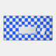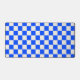 A blue and white checkerboard pattern with alternating squares fills the image, creating a geometric, balanced design with a classic, symmetrical feel.
