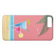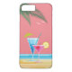 Illustration d'un cocktail tropical rose vif et bleu sur un arrière - plan de plage au ciel corallien et accentué de feuilles de palmiers et de mouettes, décorez cet iPhone 7 Plus Coque, nous rappelant les chaudes vacances ensoleillées et l'été.