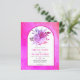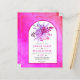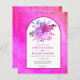 Fleurs et arche magenta rose pour invitation de mariage à petit budget avec code QR pour RSVP. Cette charmante conception de mariage affiche un cadre en arche sur fond taché de rose fuchsia. Dans le cadre, il y a des fleurs de dalia et de rose, du feuillage et de l'herbe de pampas séchée. Le dos comprend le code QR pour répondre en ligne.