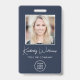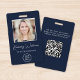 Badge d'identité bleu professionnel comportant la photo de votre employé, leur nom dans un script blanc chic et leur titre en lettrage blanc simple, ainsi que le logo de votre entreprise ou organisation. Au dos, ajoutez des informations supplémentaires et un code QR facultatif.