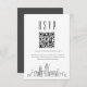 Une carte de code rsvp QR minimaliste de mariage avec un skyline stylisé représentant la ville ensoleillée de San Diego. Remplacez le code QR par un lien vers votre site Web pour faciliter la réponse à votre événement mariage pour vos futurs invités.