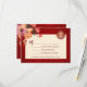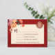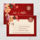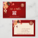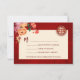 Fleurs de pivoine de tons rouges, orange et neutres sur un fond rouge scintillant et un symbole de double bonheur en or. Carte de RSVP de mariage chinois avec un code QR scannable et les noms des mariés.