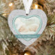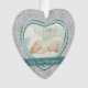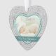 Cette ornementation de vacances en saké présente votre propre photo de bébé encadrée dans un cadre de coeur assez turquoise et bordée d'argent. Le cadre du coeur est bordé d'un motif tourbillon gris argenté. Une bannière turquoise plus foncée tient en blanc votre texte customisé; faites-le dire ce que vous voulez! L'arrière de l'ornement a la même bordure motif tourbée argentée et le cadre en forme de coeur avec du texte supplémentaire sur le turquoise correspondant à l'intérieur. Cela fait un beau cadeau de conservation pour les nouveaux parents.