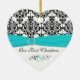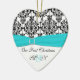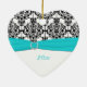 **VEUILLEZ NOTER que le ruban et les bijoux sont des oeuvres d'art et ne sont pas réels. Ce ornement en forme de coeur, en céramique, correspond à la collection Aqua, White, and Black Mariage damassé montrée ci-dessous, et ferait un chouette souvenir de votre journée spéciale.