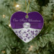 Cet ornement en forme de coeur de céramique violet et gris argenté est orné d'un ruban et d'un arc en violet IMPRIMÉ en argent avec un look sculpté FAUX orné. Il ferait un beau souvenir de votre journée spéciale, ou un grand cadeau pour les jeunes mariés, ou changer le texte et les donner comme cadeaux à vos accompagnateurs de mariage ou des personnes spéciales comme faveurs. Si vous avez besoin d'aide pour customiser cela, ou si vous voulez changer quelque chose, envoyez un courriel à niteowlstudio@gmail.com.