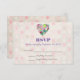 Un mariage RSVP avec un coeur illustré rempli de fleurs et de feuilles aux couleurs rose, verte et jaune. L'arrière - plan est un motif défraîchi avec des cercles en rose clair et blanc. L'été et le fantasme.