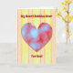 Œuvre d'art originale représentant mon cœur d'art graphique qui est une combinaison de bulles bokeh de couleurs rouge et bleue stylisées en silhouette de cœur. Le cœur est placé sur un motif rayé vintage légèrement décoloré et en détresse dans des couleurs similaires pour une apparence artistique. L'extérieur de la carte indique "Mon cœur déborde pour toi !" et l'intérieur indique "Ton amour fait éclater ma vie de joie !". Cette carte peut être une carte de la Saint-Valentin ou simplement une carte pour exprimer votre amour passionné pour quelqu'un !