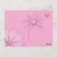 Une carte postale avec un coeur rouge sur fond rose. Au verso, qui possède également un fond rose, il y a aussi des fleurs de cosmea et un petit coeur rose. Ces éléments sont légèrement opaques. Une carte postale pour ses proches !