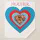 Coeurs colorés sur une couverture Sherpa blanche avec nom personnalisé.
