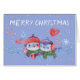 Sur le devant de cette carte de voeux de Fêtes, deux adorables petits pingouins s'agglutinent tandis que les coeurs rouges et les flocons de neige tombent autour d'eux. Les deux pingouins portent du casquette et des foulards, et l'un tient une tasse de chocolat chaud. Le texte blanc en haut de la carte indique "Joyeux Noël". Les images et le texte sont placés sur un arrière - plan bleu glacé.Le haut intérieur de la carte répète l'arrière - plan bleu, tandis que le fond blanc a une autre image d'un pingouin avec un sucre de canne et un coeur, et plusieurs champs de texte pour vous de customiser.