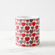Cette tasse a un design de Saint-Valentin de coeurs répétitifs avec différents graphismes à l'intérieur sur un champ de blanc.