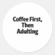 Show your love for coffee and humor with this “Coffee First, Then Adulting” sticker.